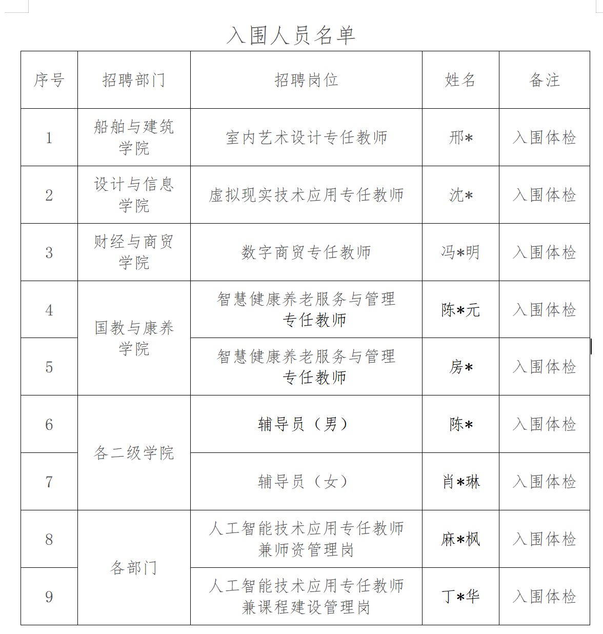 經(jīng)公開招聘筆試、資格復(fù)審、試講、面試等環(huán)節(jié),現(xiàn)公布入圍體檢、考察環(huán)節(jié)的人員名單。相應(yīng)崗位入圍人員需在指定時間參加學(xué)校組織的體檢與考察。