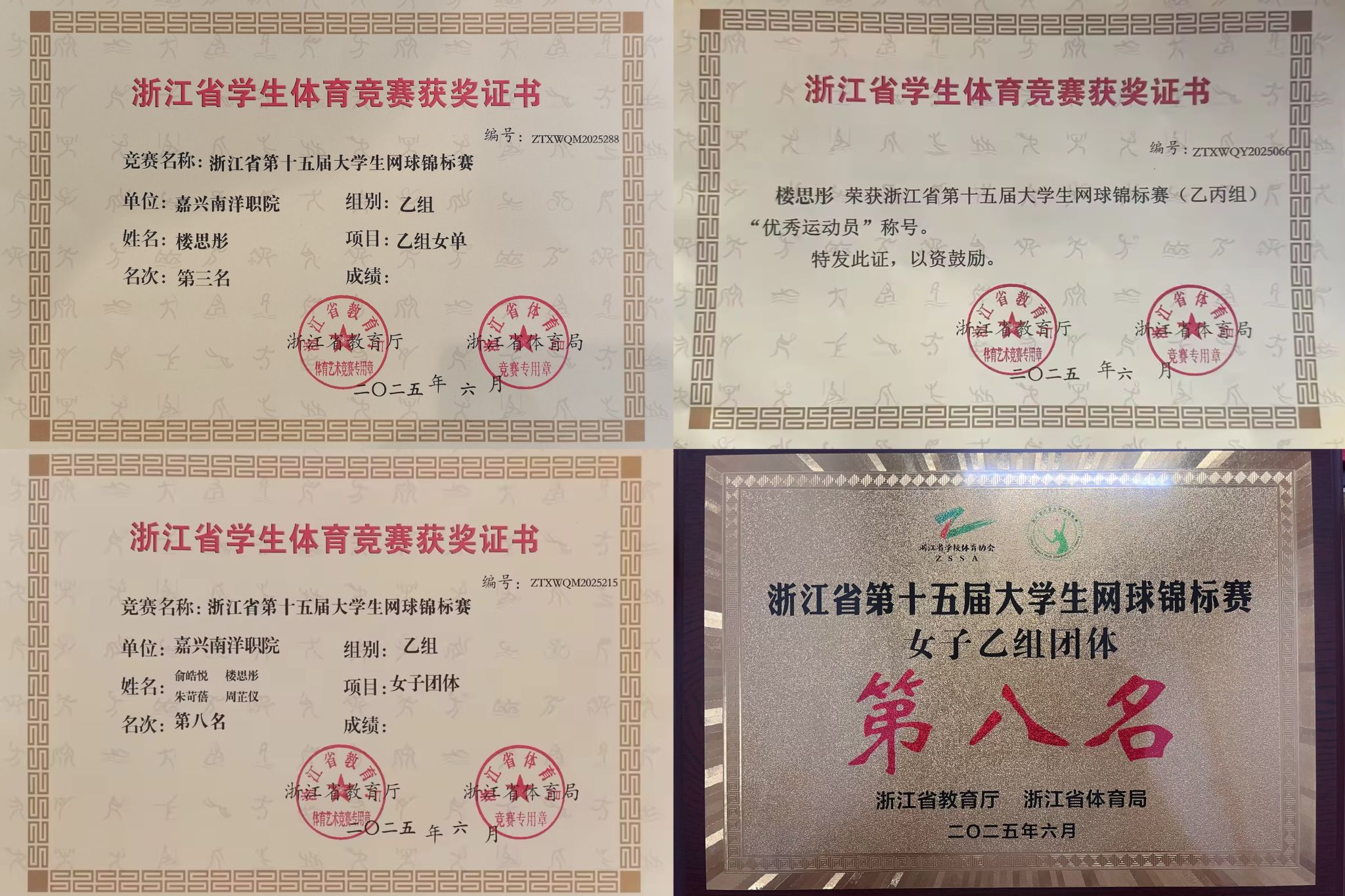 6月8日,由浙江省教育廳、浙江省體育局主辦,永康市文化和廣電旅游體育局承辦的2025年浙江省第十五屆大學(xué)生網(wǎng)球錦標(biāo)賽(乙丙組)在永康市新起點(diǎn)網(wǎng)球中心落下帷幕。來(lái)自全省各高等職業(yè)院校的二十多支隊(duì)伍參加了此次比賽。馬克思主義學(xué)院、文化與體育健康學(xué)院孔瑞云教練指導(dǎo)的8位網(wǎng)球隊(duì)隊(duì)員最終斬獲女子單打第三名、女子團(tuán)體第八名的優(yōu)異成績(jī)。