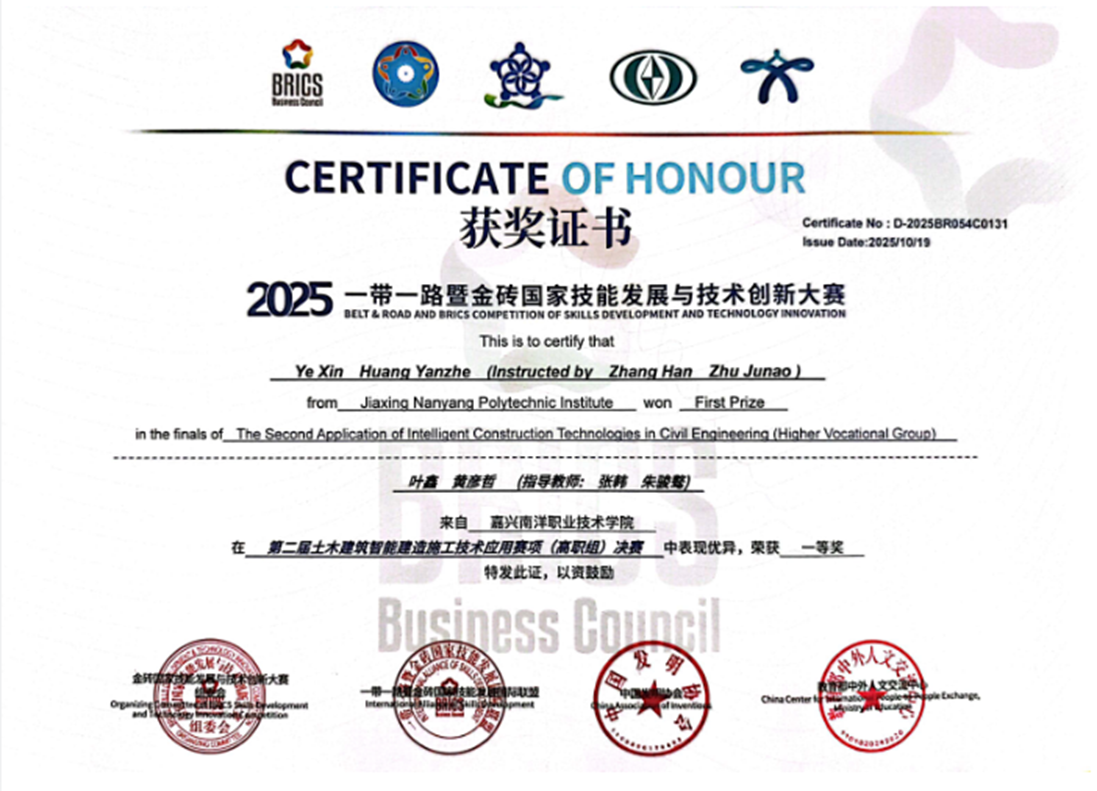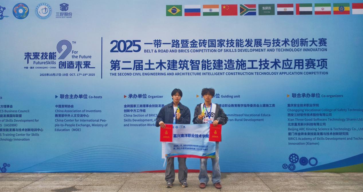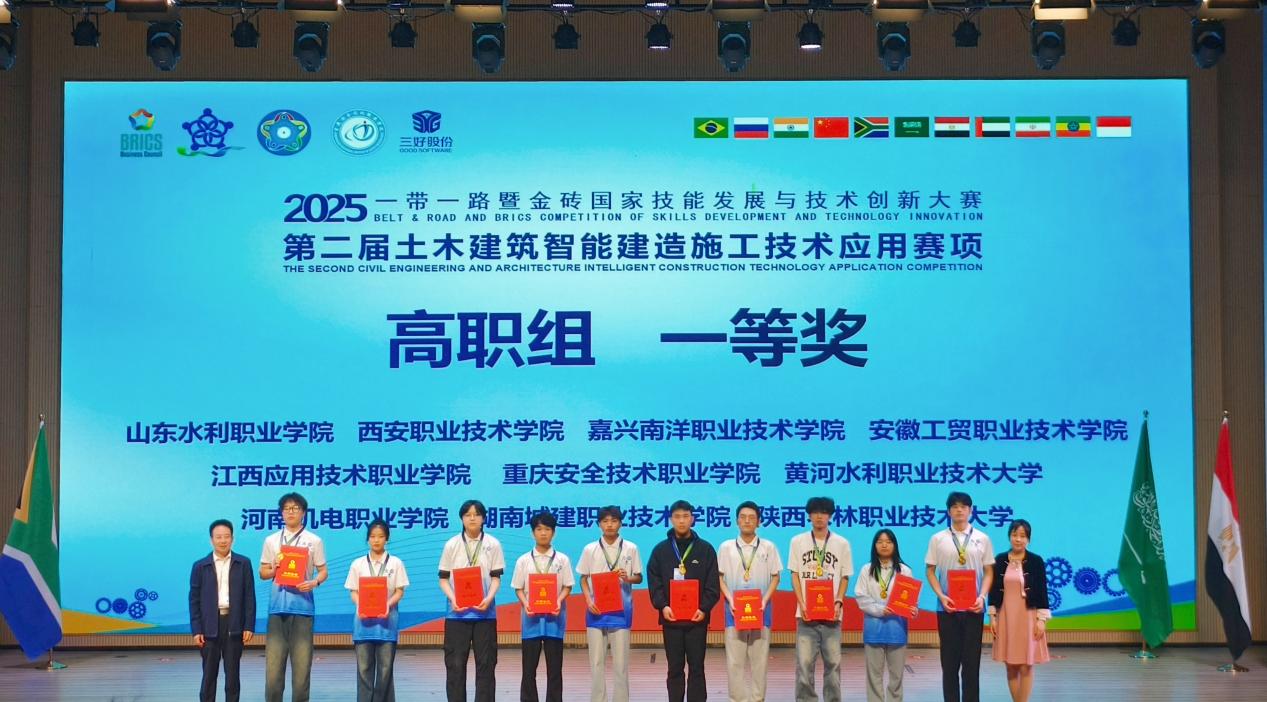 近日,2025“一帶一路”暨金磚國(guó)家技能發(fā)展與技術(shù)創(chuàng)新大賽第二屆土木建筑智能建造施工技術(shù)應(yīng)用賽項(xiàng)(高職組)全國(guó)總決賽在重慶安全技術(shù)職業(yè)學(xué)院圓滿落幕。我校由張韓、朱駿驁兩位老師指導(dǎo)的葉鑫、黃彥哲兩位同學(xué)組成的團(tuán)隊(duì)勇奪大賽一等獎(jiǎng)。