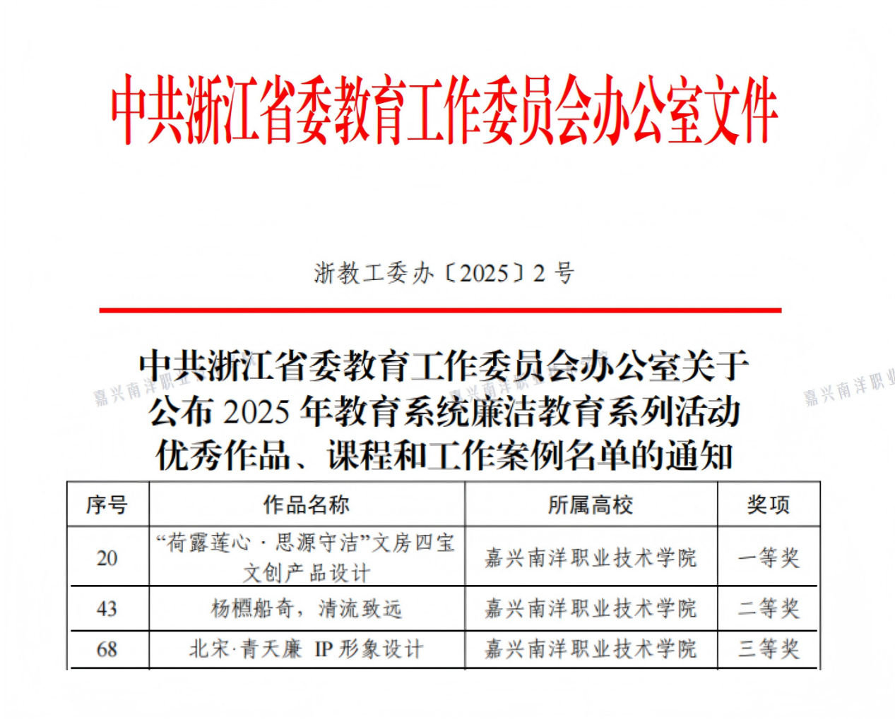近日,2025年浙江省教育系統(tǒng)廉潔教育系列活動優(yōu)秀作品評選結果正式公布。學校選送的三件作品在評選中脫穎而出,獲一二三等獎各1項,實現(xiàn)了歷史性突破,充分展現(xiàn)了學校廉潔文化建設的豐碩成果。