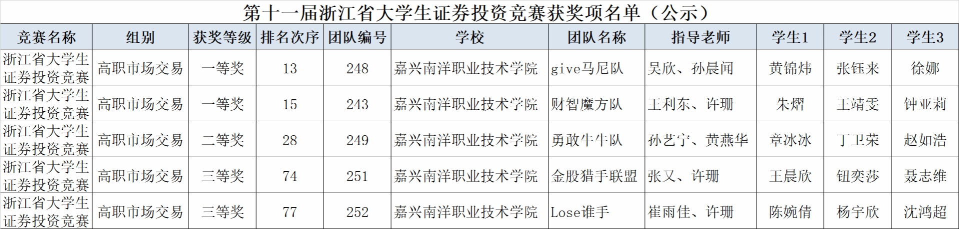 據(jù)悉,本次大賽吸引全省本專科78所學(xué)校的1312支團(tuán)隊(duì)參賽,競爭異常激烈,共評出一等獎109名,二等獎164名,三等獎275名。優(yōu)異成績的背后,是我校指導(dǎo)教師們的精心組織與悉心付出,以及參賽同學(xué)們的勤勉鉆研與不懈努力。各參賽團(tuán)隊(duì)充分發(fā)揮專業(yè)優(yōu)勢,密切關(guān)注市場動態(tài),不斷優(yōu)化投資策略,以扎實(shí)的理論功底和出色的實(shí)操能力,最終在強(qiáng)手如林的賽場上斬獲5項(xiàng)大獎,充分展現(xiàn)了我校學(xué)子在金融證券領(lǐng)域的過硬實(shí)力和良好素養(yǎng)。