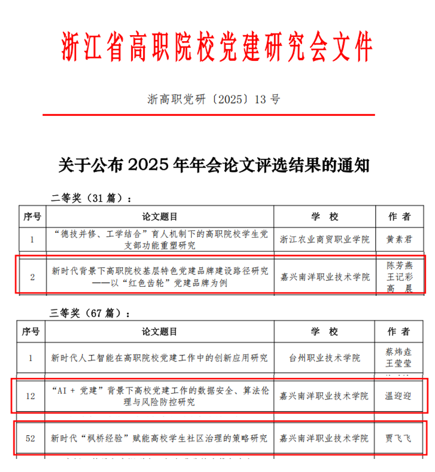 會(huì)議表彰了2025年年會(huì)論文評(píng)選獲獎(jiǎng)人員。其中,學(xué)校機(jī)電與交通學(xué)院黨總支陳芳燕、王記彩、高晨三位老師共同撰寫的論文《新時(shí)代背景下高職院校基層特色黨建品牌建設(shè)路徑研究——以“紅色齒輪”黨建品牌為例》獲二等獎(jiǎng)。機(jī)電與交通學(xué)院黨總支賈飛飛老師撰寫的論文《新時(shí)代“楓橋經(jīng)驗(yàn)”賦能高校學(xué)生社區(qū)治理的策略研究》和黨委組織部溫迎迎老師撰寫的論文《“AI+黨建”背景下高校黨建工作的數(shù)據(jù)安全、算法倫理與風(fēng)險(xiǎn)防控研究》均獲三等獎(jiǎng)。陳芳燕作為學(xué)校獲獎(jiǎng)教師代表上臺(tái)領(lǐng)獎(jiǎng)。